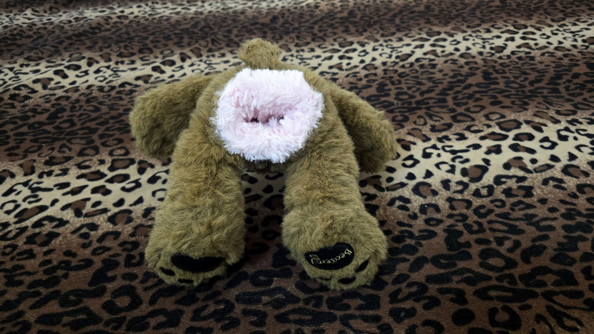 Has a brown over coat with black leather foot paws. And cream colored muzzle.