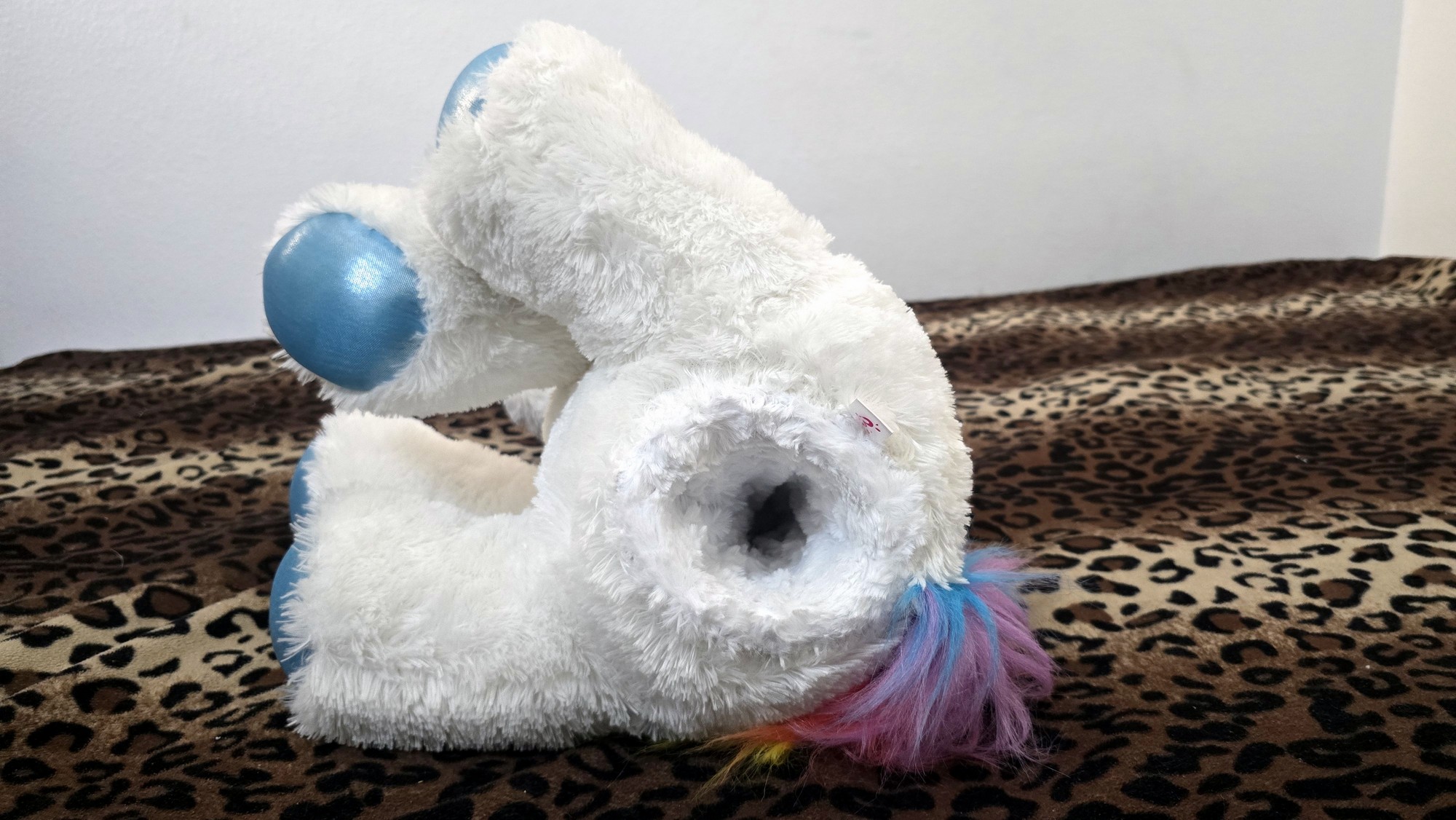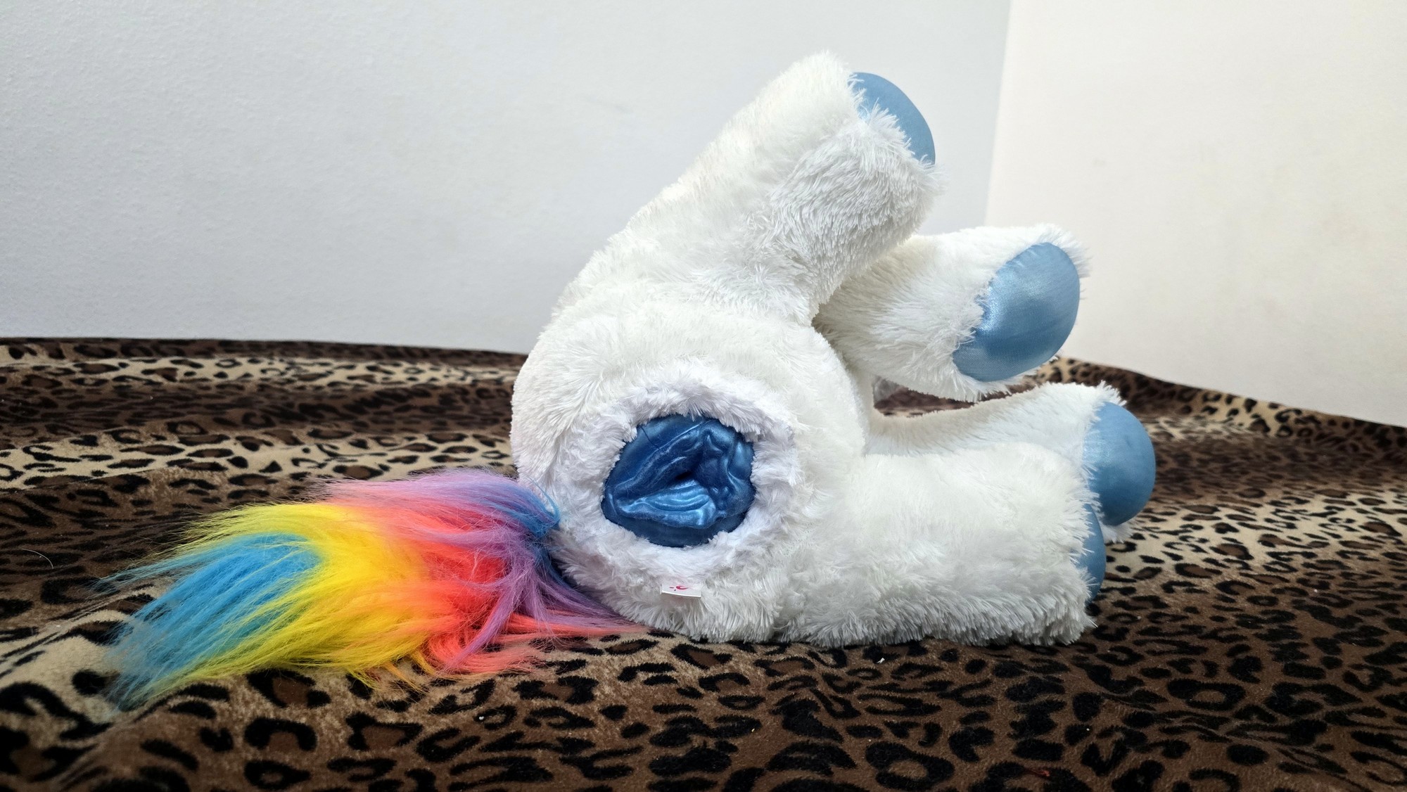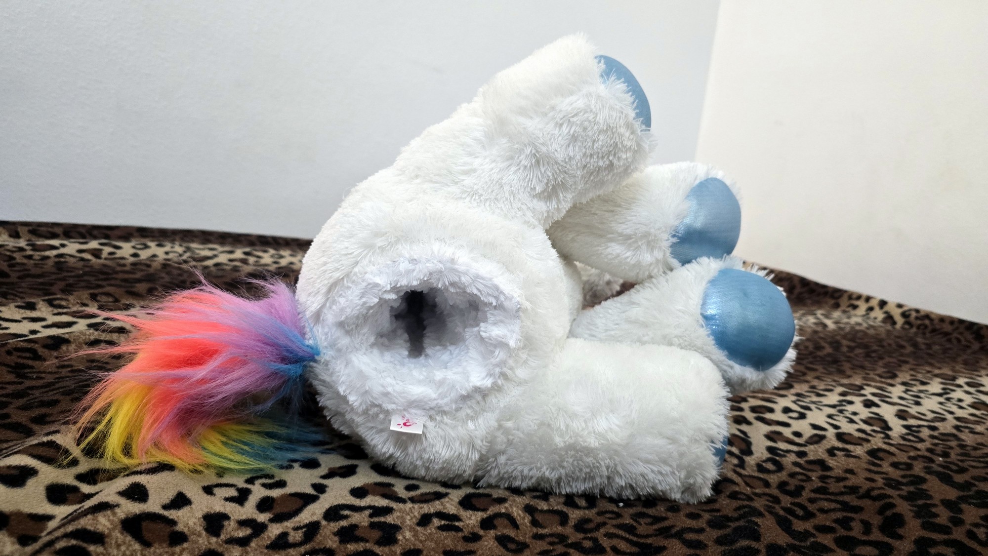 Has a white overcoat with blue foot paws and a blue horn and rainbow mane.