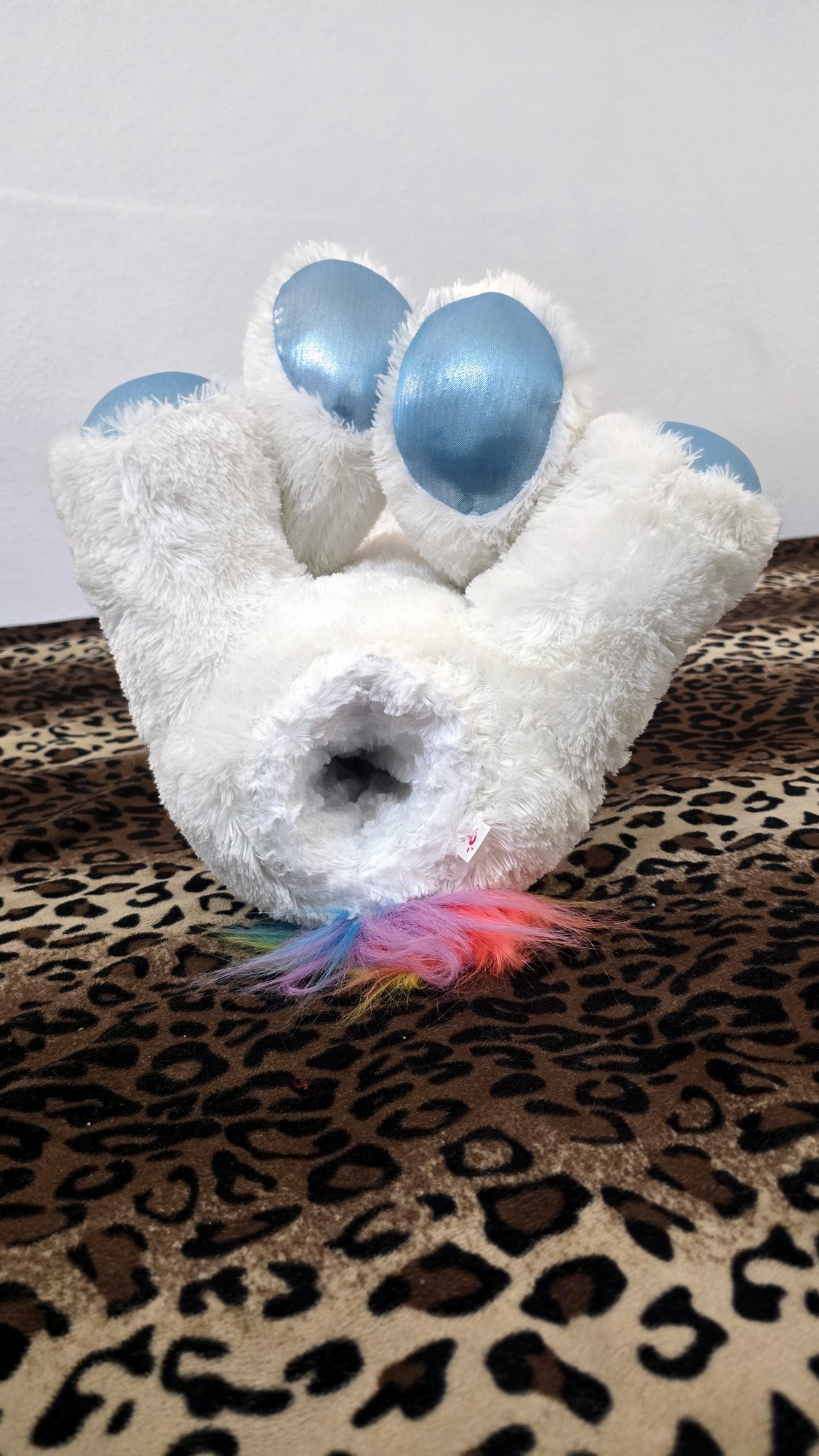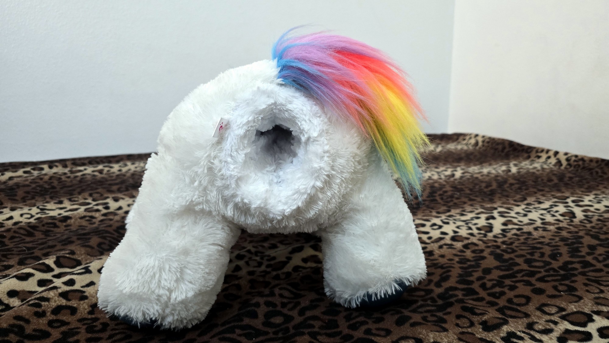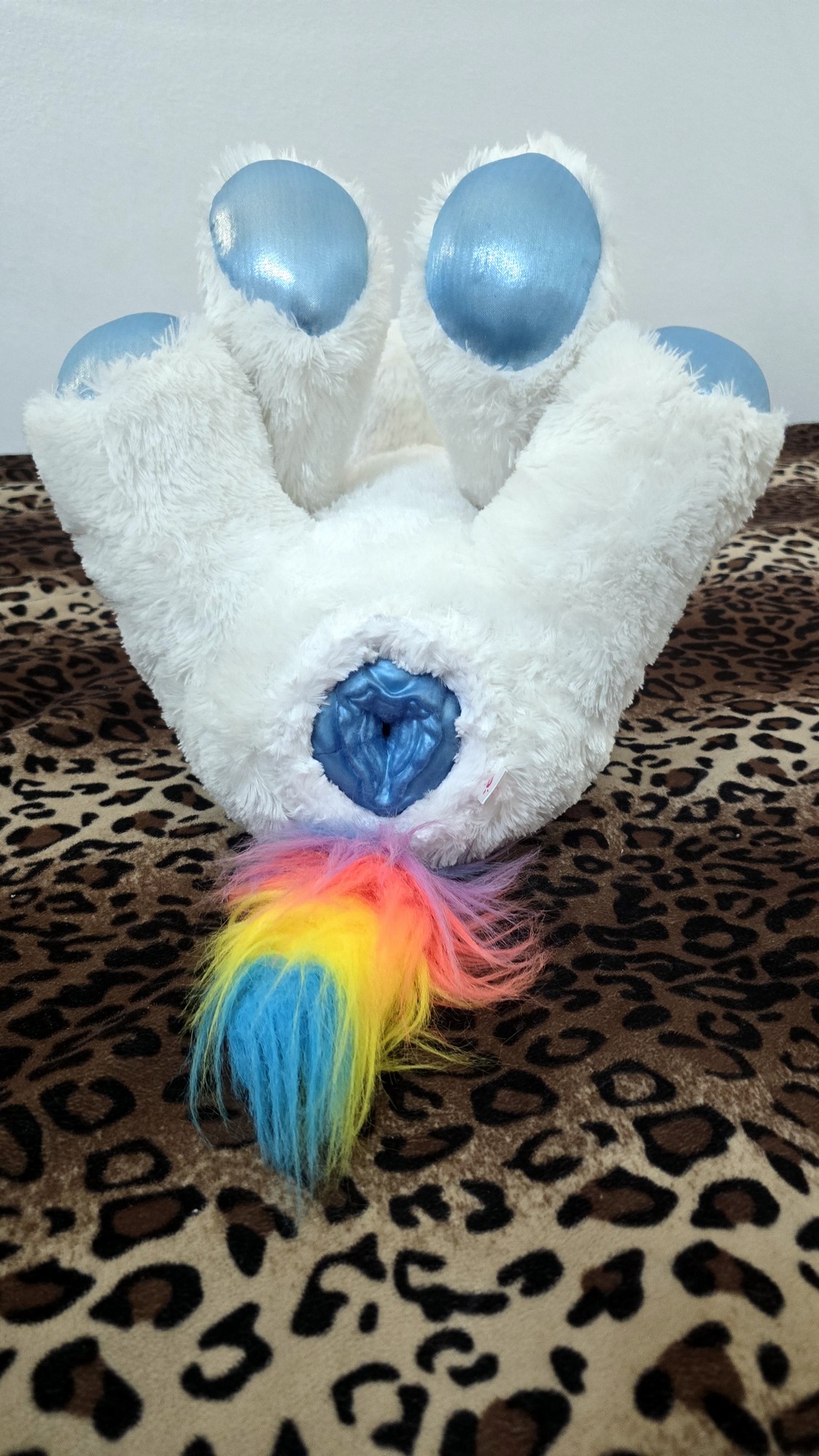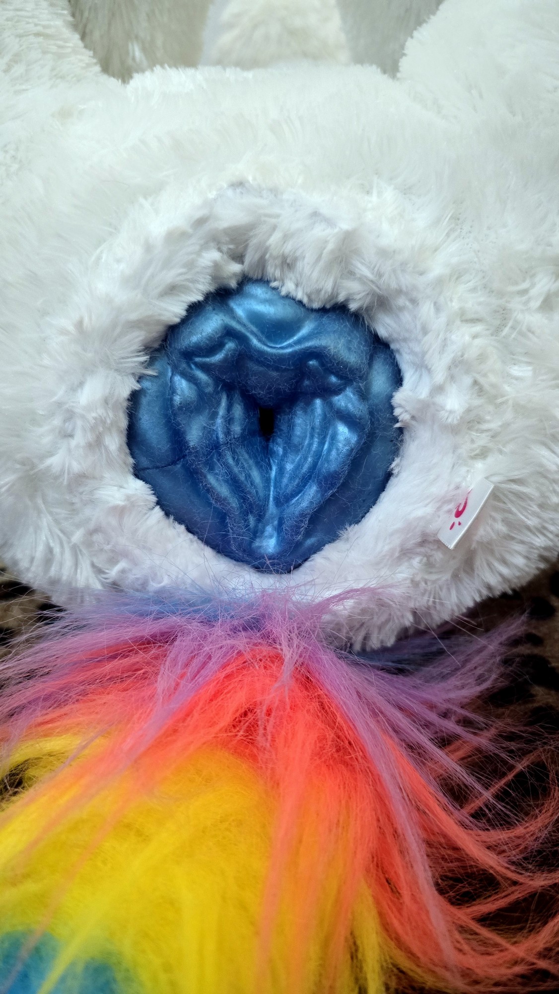 Has a white overcoat with blue foot paws and a blue horn and rainbow mane.